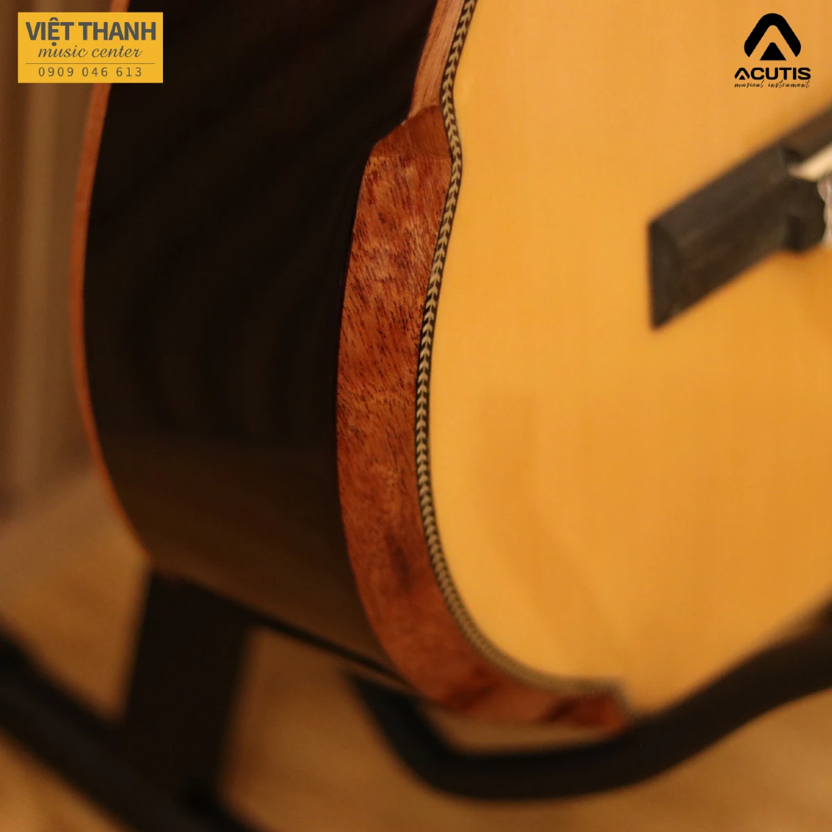 Mặt trước Acutis ATC160Q sử dụng gỗ Spruce (Vân Sam) – loại gỗ được đánh giá cao trong sản xuất guitar nhờ khả năng tái tạo âm thanh rõ ràng. Gỗ Spruce mang lại tiếng đàn vang, phù hợp với các dòng nhạc classical.